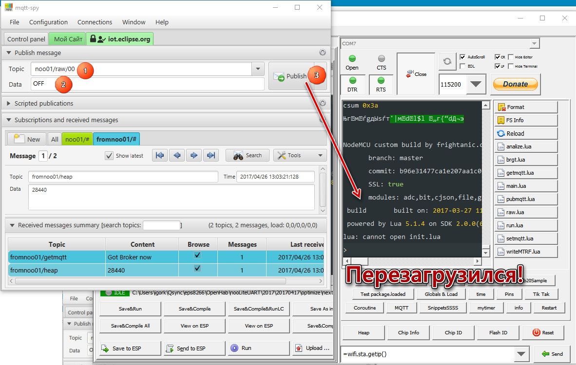 А теперь при помощи MqttSpy делаем «раз-два-три» — и окне ESPlorer наблюдаем перезагрузку устройства.