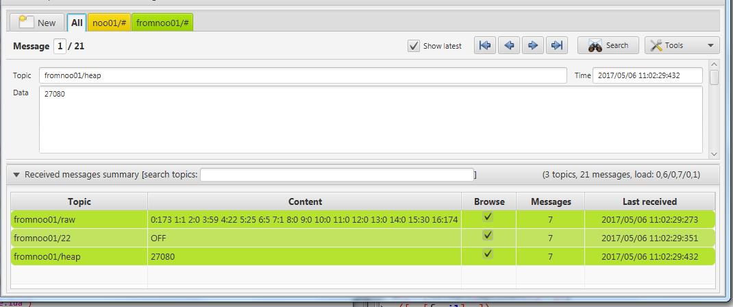 В любом случае, приходит информация в топике fromnoo01/raw, и одновременно в топике, типа fromnoo01/00, где две цифры после слэша — номер ячейки MTRF-64.