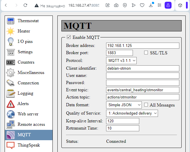 Предварительно надо понимать, что «прозрачный» режим работы требует поддержки стороннего приложения OpenTherm Monitor и, следовательно, это приложение необходимо куда-то установить: лучший вариант — виртуальная машина linux. Или на малинку, где у вас удобно располагается Home Assistant/Open HAB/Domoticz, etc. Приложение будет забирать данные с SLS и удобочитаемом виде шарить их разными способами: отправлять на MQTT брокер, показывать на собственном сервере или отдавать по TCP соединению. Причем для такого случая в Hоme Assistant есть интеграция, которая обещает работать с монитором напрямую. Мне свое обещание она не исполнила: отваливалась постоянно, но может у кого и получится. Я не особо переживаю — привык работать исключительно с MQTT.